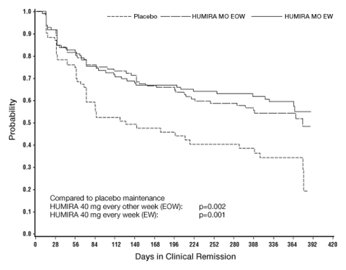 Kontrollierte Daten über eine Therapie mit Humira im Vergleich zu Placebo liegen für eine Dauer von 52 Wochen vor. In einer Placebo kontrollierten Vergleichsstudie mit Patienten, bei welchen unter einer Humira-Therapie eine anhaltende Beschwerdefreiheit bis zur 33. Woche erzielt wurde, blieben unter Weiterführung mit Humira 95,1% der Patienten bis zur 52. Woche rezidivfrei, unter Placebo (d.h. nach Absetzen von Humira in der Woche 33) 71,6%.
