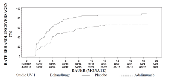 Eine Sensitivitätsanalyse des primären Endpunktes, in welcher Patienten, die vorzeitig abbrachen und solche, die unerlaubterweise Kortikosteroide als Begleitmedikation nahmen, als Behandlungsversager gezählt wurden, zeigte einen starken Behandlungseffekt zugunsten von Humira (UV I: HR=0.66, 95%CI 0.48 – 0.88, p=0.005; UV II: HR=0.59, 95%CI 0.42-0.81, p=0.001).
