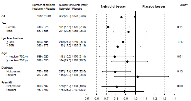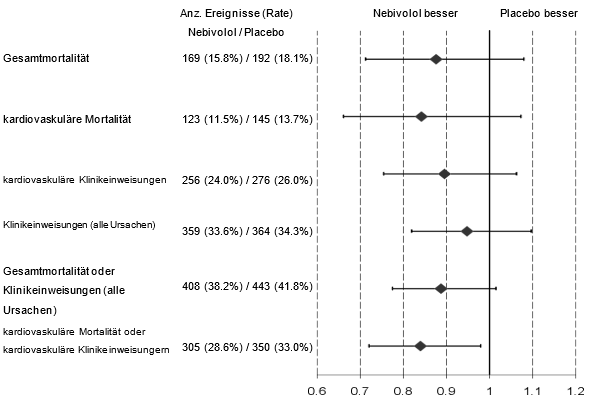 In einer placebo-kontrollierten Mortalitäts-/Morbiditäts-Studie mit 2128 Patienten (≥70 Jahre) mit chronischer Herzinsuffizienz (NYHA-Klasse I: 2.8 %, II: 56.4 %, III: 38.8 %, IV: 2.0 %) und einer reduzierten oder erhaltenen linksventrikulären Auswurffraktion, verlängerte Nebivolol als Zusatz zur Standardtherapie die Zeit bis zum Auftreten von Todesfällen oder Klinikeinweisungen infolge kardiovaskulärer Ereignisse (primärer Endpunkt). Die relative Risikoreduktion betrug 14% (absolute Risikoreduktion 4.2 %).