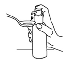 La solution ainsi délivrée doit être jetée. À la prochaine pression complète de la tête de la pompe doseuse vers le bas (ce qui équivaut à une activation de la pompe), la dose adéquate est alors dispensée (1 pression sur la pompe est équivalente à 0,5 ml de solution buvable et contient 5 mg de chlorhydrate de mémantine, la substance active, Fig. 6).