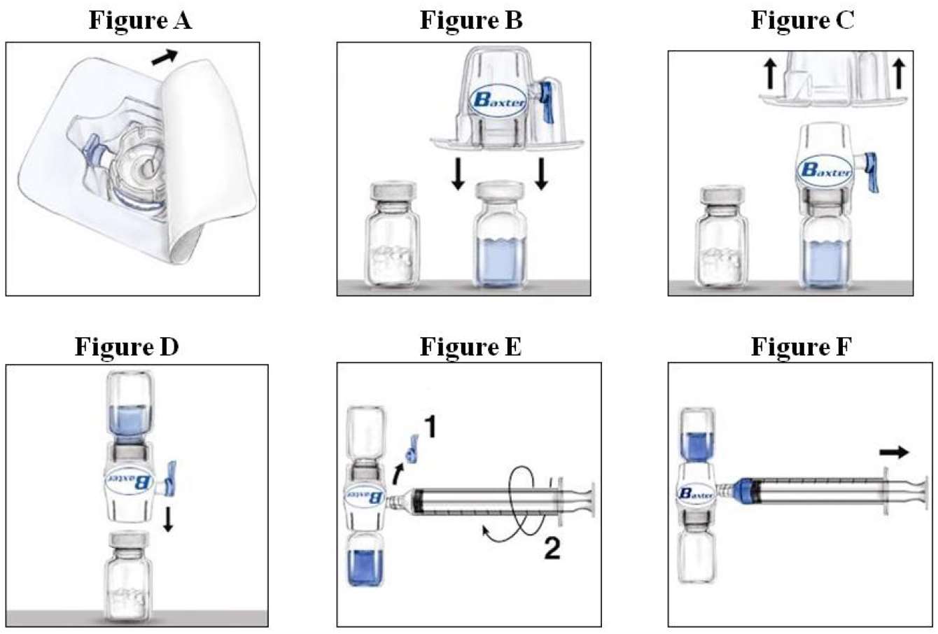4.Ouvrez l’emballage de BAXJECT II en retirant l’opercule sans toucher l’intérieur (Fig. A). Ne retirez pas le dispositif de l’emballage. Il faut faire attention au fait que BAXJECT II est prévu pour l’utilisation de seulement un flacon unique de RIXUBIS et d'eau stérile pour préparations injectables. Pour cette raison il est nécessaire d’utiliser un deuxième dispositif BAXJECT II pour une autre reconstitution et une autre aspiration de la solution dans la seringue.