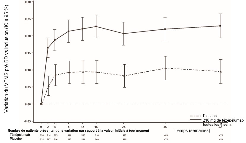 La variation du VEMS par rapport à la valeur initiale a été évaluée en tant que critère d'évaluation secondaire des études PATHWAY et NAVIGATOR. En comparaison avec le placebo, TEZSPIRE a induit une amélioration cliniquement significative de la variation moyenne du VEMS par rapport à la valeur initiale lors des deux études (Tableau 4).