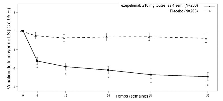 * Indique une valeur p non ajustée <0,01 pour la comparaison du traitement tézépélumab 210 mg toutes les 4 semaines versus placebo.